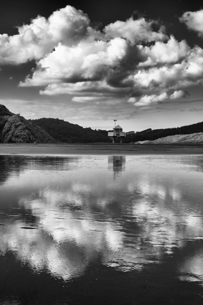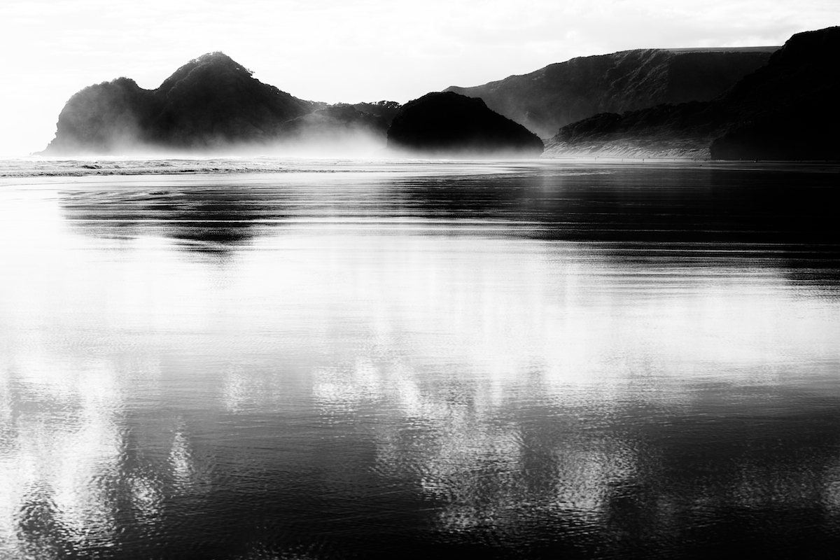 One of the great things about living in Auckland is the diversity of the coastline. You can drive from the Tasman Sea to the Pacific Ocean in less than an hour. On the eastern side, the Pacific, the beaches are characterised by calm, blue seas — though there are surf beaches to be found — and sheltered bays of golden sand fringed by hills and cliffs of pohutukawa trees. The west coast, on the other hand, is a totally different story. Here, in the Waitakere region, shaped eons ago by violent volcanic activity, the coastline is rugged and forested, the sea wild and dangerous. It is an area of outstanding natural beauty and endowed with a unique ambiance, where nature is truly, and fully, in charge. Bethells Beach is typical of west coast beaches: wild, atmospheric, with an expanse of volcanic sand backed by weathered, eroded, bush-clad cliffs.
