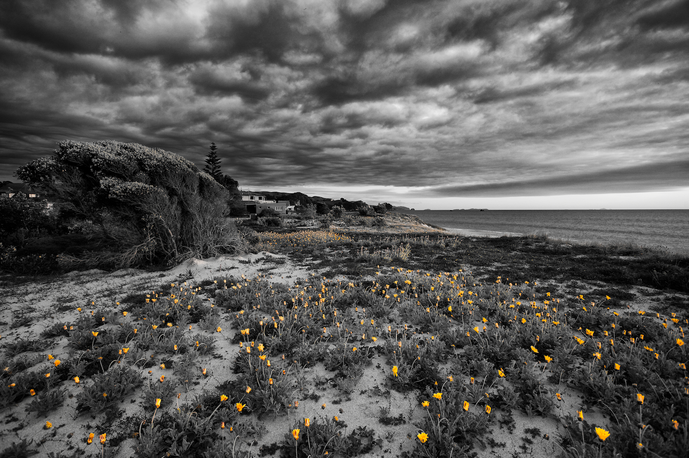 This is a spring photograph because, as much as I like autumn, I know I have to get through winter first. So I thought I would share the feeling of longing I have for that season of renewal. Besides, I know you guys in the Northern Hemisphere will be experiencing now what we down here at the bottom of the world are merely anticipating. When I lived in Trinidad we had no spring, so when we came to New Zealand one of the things I enjoyed most were the changing seasons as it reminded me of my English roots that I realised I had missed. In England, the arrival of spring was marked by daffodils, tulips, woods filled with carpets of bluebells and orchards of apple blossom. Here in New Zealand, you know spring has sprung from the fields of prancing and skipping lambs, the lustre of brightest green in the leaves of our trees, and the exuberance of singing birds. But if you go to the beach in spring , like the one above in Whiritoa on the Coromandel Peninsula near Auckland, you will find the dunes alive with a wondrous carpet of blooms. For this photograph I got up at dawn and waited for the sun to peep over the horizon. When it did, the flowers seemed to wake up and switch on like light bulbs, opening their petals wide to catch the ascending sun before it disappeared behind the clouds.