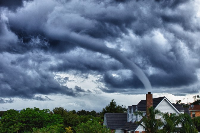 Auckland, being situated on a narrow isthmus between the Tasman Sea and Pacific Ocean, is well known for its variable weather. “Four seasons in one day’ goes the line of a song by Kiwi band Crowded House. Come autumn and winter, the craziness of our local climate goes into overdrive, but this was taken in midsummer, from the deck of our house. It’s actually not a tornado forming, as I first thought, frantically worrying where to hide the kids and me, but the remains of a waterspout that drifted overland. It seems to have emanated from next door’s chimney, the secret fount of all our crazy weather!