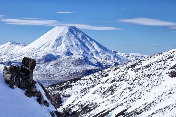 It certainly didn’t look as inviting when Frodo and Sam arrived in Mordor to cast The One Ring into the fires of Mount Doom. But then, Peter Jackson had filmed that sequence of Return of the King in summer. Mt Ngauruhoe (pronouced Nara-ho-ee) in summer looks the part, a desolate volcanic wilderness that makes the perfect match for Mordor, and some CGI thrown in. But it’s in winter when Mt Ngauruhoe really sparkles, like a giant sugar cone. This classic volcano is, I reckon, New Zealand’s 2nd most beautiful volcano after Mt Taranaki. Situated in the World Heritage Area of Tongariro National Park between the volcanoes of Mt Tongariro and Mt Ruapehu on the Central Plateau, it erupted 45 times during the 20th century, most recently in 1977. I took the photo from the slopes of Mt Ruapehu, climbing an icy path above the nursery ski slopes to find a fantastic outlook over a valley and this mesmerising mountain. I slithered and slipped most of the way down, but it was worth it. Being such a photogenic volcano, I took many pictures, and here are a few more.