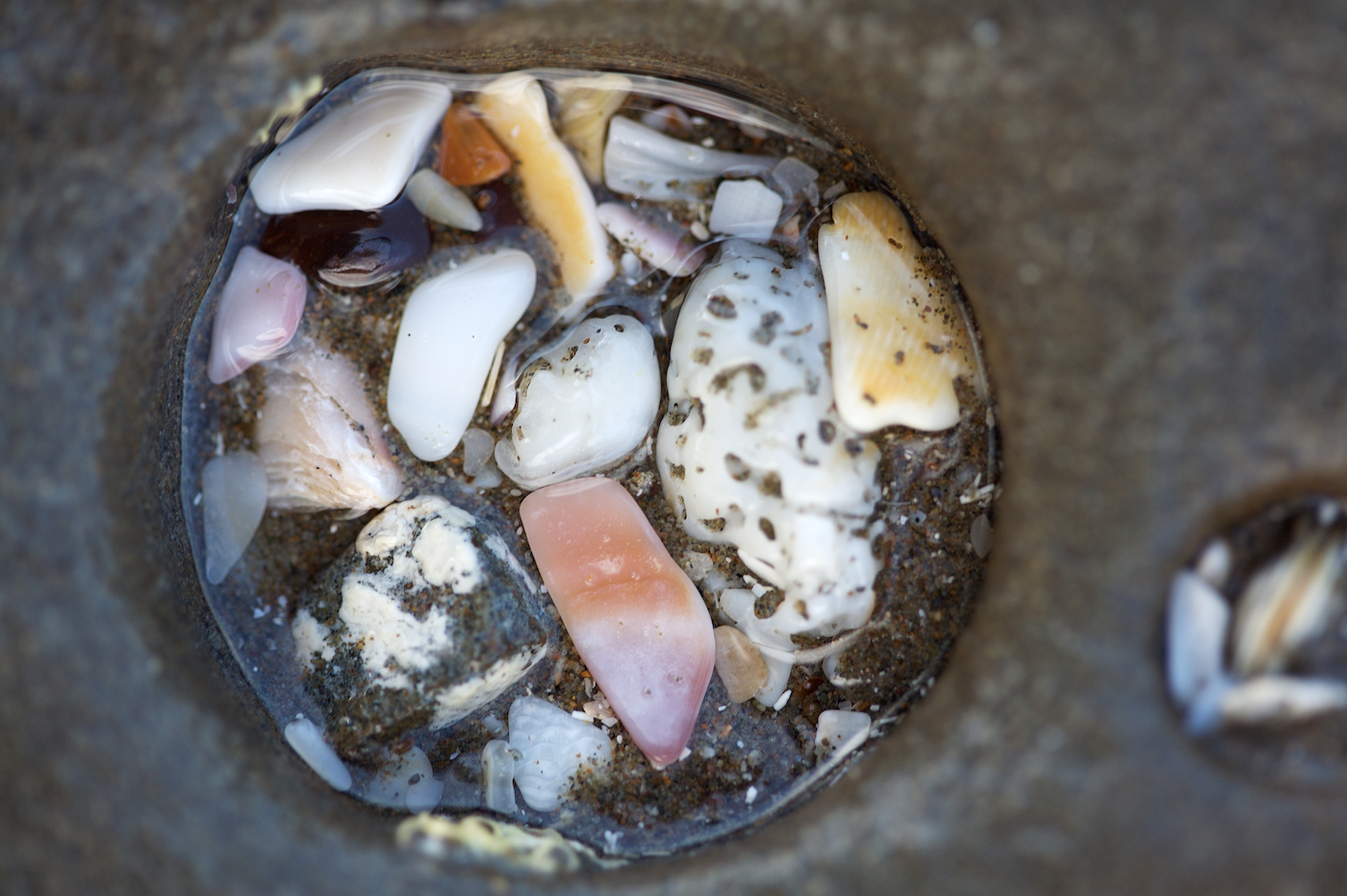 I was given a Canon macro lens for my birthday, 100mm f2 to be precise. While it serves as an excellent portrait lens — it’s really sharp — it is still most fun used for what it was designed to do. I have been amazed at the hitherto secret life around us made miraculously visible through the wonder of this incredible lens. But I have found it very hard to use unless supported with a tripod. This photo, however, was not tripod mounted. Instead, I got down on my knees on a slab of exposed rock at low tide at Granny’s Bay Marine Reserve — part of Long Bay Regional Park — and focused on a series of small craters that pitted the rock, like a slice of Swiss cheese. I was amazed to find the holes all filled with tiny shell fragments encased in bubbles, like this one. The marine reserve at Granny’s Bay has some wonderfully coloured streaks of sand which, upon closer inspection, are made of myriads of minute shell fragments, like the one below. But you’d never really know without this lens.