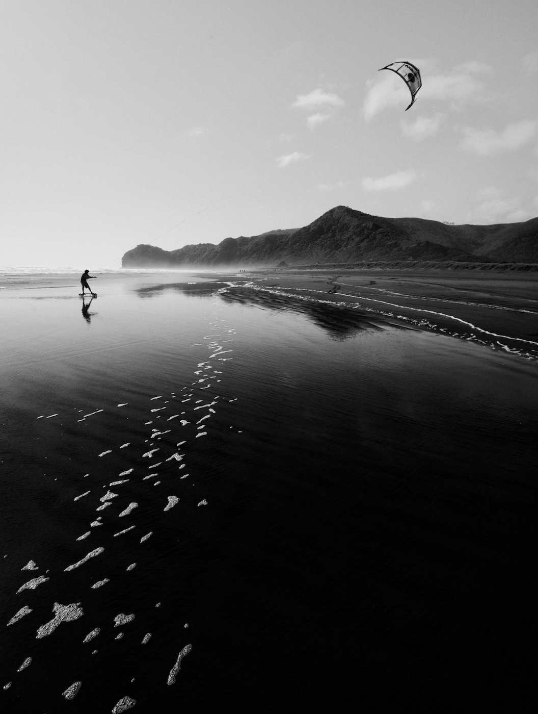 Piha is a volcanic black sand beach renowned for its dangerous rips and is the home of Auckland surfing — the photo at the top of this page is Piha. So large can the seas be and so deadly the rips, that every year a TV reality show is filmed there called “PIha Rescue” which follows the lifeguard crews as they pluck swimmers or anglers swept from the rocks to safety. But, sadly, there are quite often unhappy endings at Piha, the result of one too many beers before hitting the surf, or simply underestimating the power of the currents that take hold here. I’ve never found it an appealing place to swim: dangerous and cold, and I’m amazed it’s so popular. As a place to visit and simply chill out, though, it takes some beating. It’s the most spectacular of Auckland’s west coast beaches and is imbued with a special ambience which is why so many people live here, or holiday, in houses that cling to the bush clad hills that enclose the beach. I seem to find myself visiting Piha mostly in the autumn, winter or spring when we enjoy walks along the beach or on the network of walking trails on the surrounding cliffs. Even when it’s cold there are people in the sea, but if I were to do any surfing at Piha, it would be of this nature. It’s safer! This was taken on the move, almost running after the guy with the kite, with a 17mm-wide lens to add impact to the trail of bubbles leading into the frame . I finished it with Silver Efex Pro as I like the blackness it adds to the volcanic sand and silhouetted surfer.