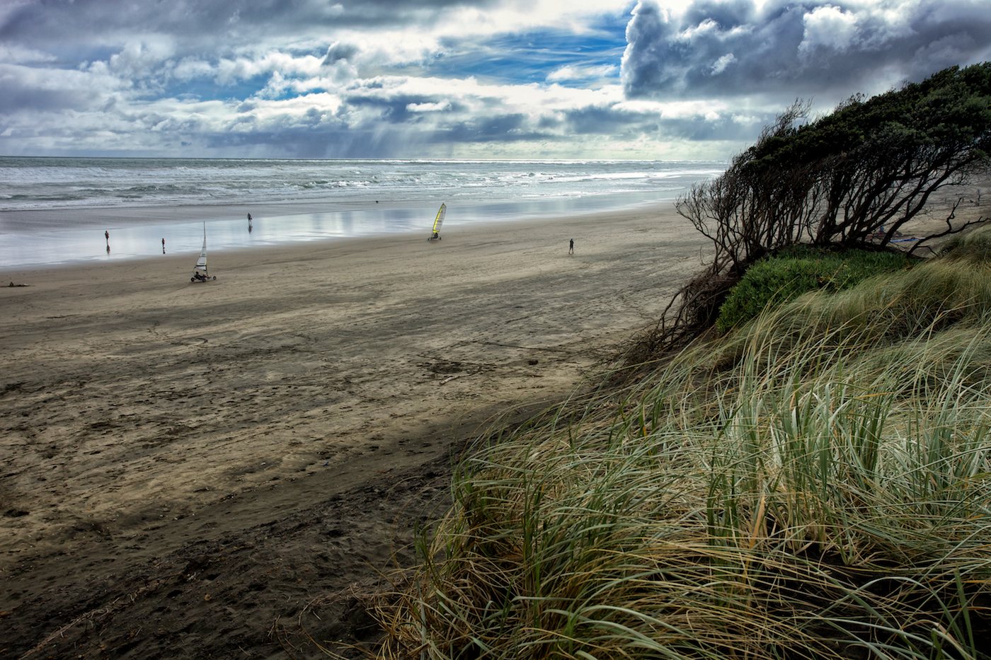 Rain, gusts, gales, squalls: we’ve had the lot these last few weeks. In the South Island they’ve had to deal with the snow. Here in Auckland it’s been cold, too, but with monotonous wind and rain instead. Try hanging out the washing in these conditions and see how far it gets you. There’s not a lot to like about Auckland’s wet, windy winters. At least snow looks nice. But, in between the downpours, it’s worth getting out to places like Muriwai, home to the famous gannet colony and an enormously long beach upon which all sorts of foolhardy souls can be found doing their thing. On this day it was the sand, or is it kite, surfers? Either way it looks like great fun and those guys really move when the wind gets up. I could barely keep my balance for this photo and several times was nearly blown off the dunes.