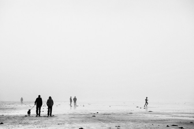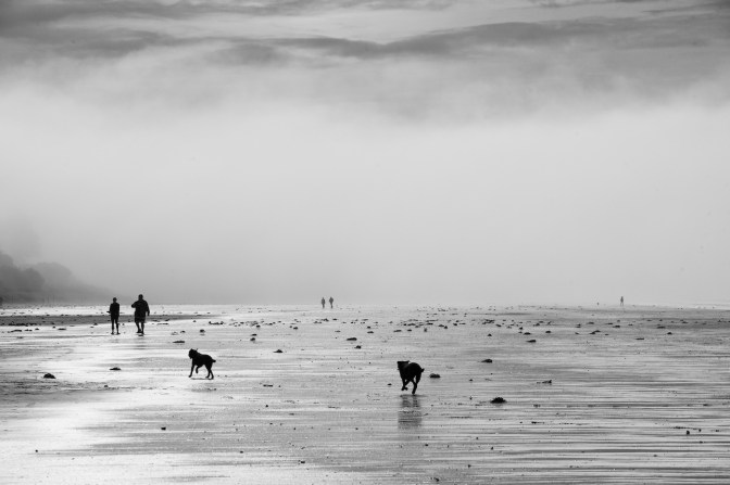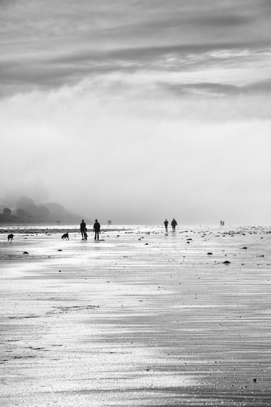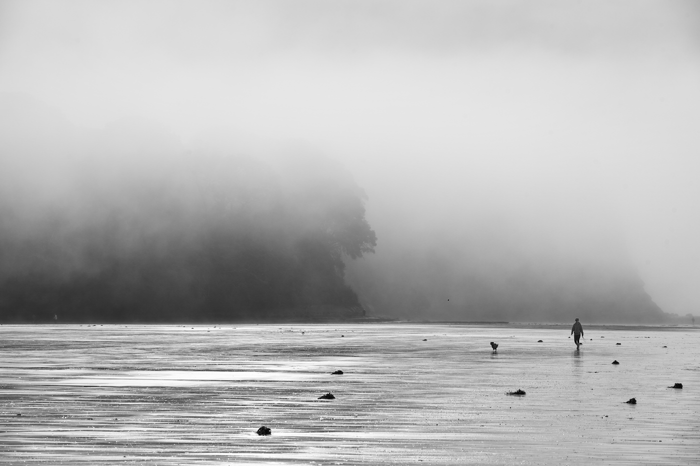 I am a total sucker for mist, or fog, or anything that adds unusual drama and light to a photograph. One day last week, after days of flooding weird and wild weather, we were treated to a thick blanket of fog over the Auckland area. Planes were grounded and the morning traffic moved even slower than usual. But not me. I took flight and sped, as safely as possible, to anywhere I thought that the fog would offer something interesting in the way of a photo or two. I found it, after a fruitless hours search down the road, at my local beach, Long Bay. The mist was retreating from one side of the beach as I arrived, burning off slowly and revealing the outlines of the cliffs and pohutukawa trees. And out of the mist came walkers, couples and their dogs; strange shadowy shapes drifting in and out of focus. It was eerie and strange, like a post apocalyptic movie scene of sombre figures moving softly, away from something silent hidden in the mist . . .