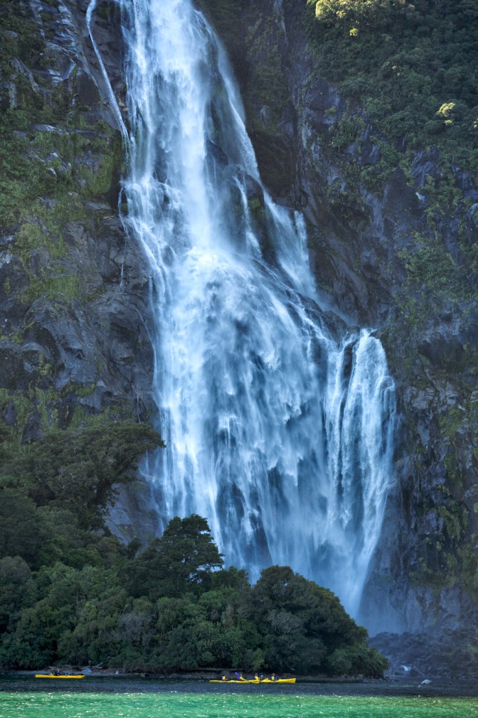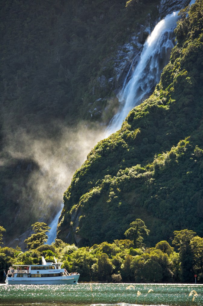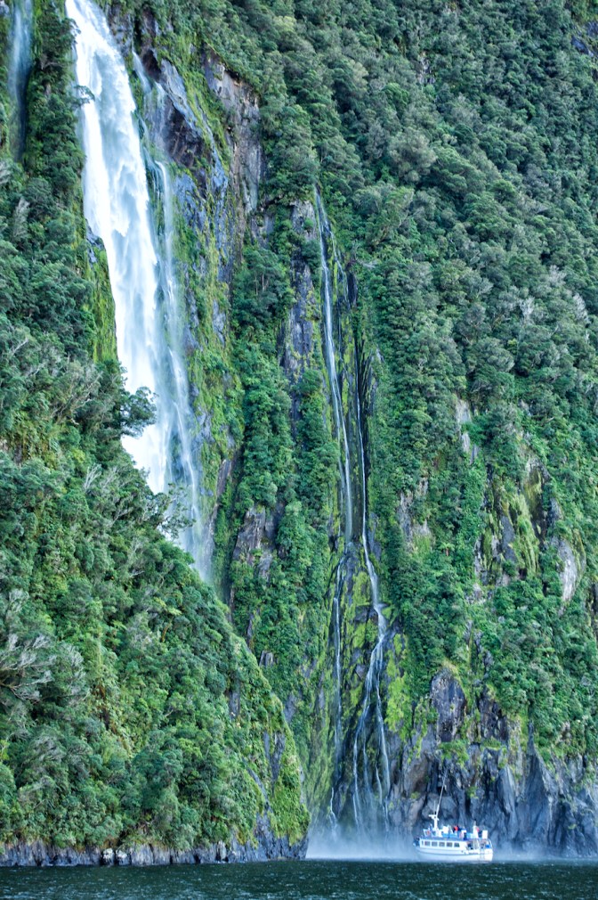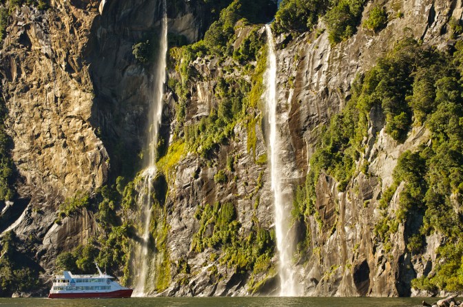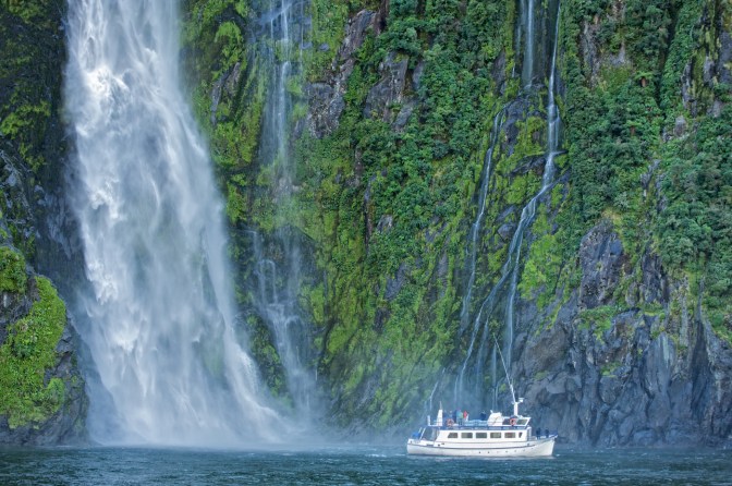 Many people say that visiting Milford Sound during wet and stormy weather shows off this extraordinary place in a way a sunny day cannot. When the peaks are hidden beneath lowering clouds filled with rain the sheer rock faces weep — uncontrollably. Hundreds of waterfalls appear alongside the two permanent ones, Lady Bowen Falls and Stirling falls, sending torrents of water cascading in spectacular fashion down the cliffs. Certainly, some of the photography I’ve seen in conditions like that are awesome in their atmospheric mood, but I would feel a bit miffed if I journeyed all the way to this wonderful place and wasn’t able to see it properly because of the weather. And this can be a real danger as the West Coast of New Zealand, and Fiordland in particular, are the wettest parts of the country. Indeed, areas of Fiordland and Westland were the only places Maori were unable to settle, such can be the inhospitable nature of these beautiful but uncomfortable wildernesses. Even when the rain has stopped, the waterfalls carry on for a few days fed by water drenched moss. These photographs were taken on my first visit to Milford Sound when the sun shone all day. Thank heavens!