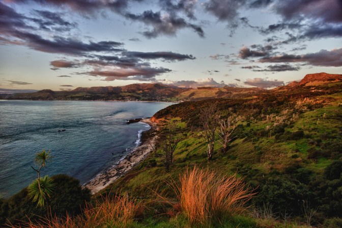 I’m preparing for an exhibition of my photography which I’m holding in conjunction with my sister who paints. So while she has to knock out about 30 paintings by November, I merely have to choose which of my photos I want to include and print and frame them. Actually, that’s not as straightforward as it sounds because deciding on sizes to print, and whether to do them in black and white or colour or canvas, is proving pretty tricky. This photo I have always liked and will print large on canvas, as it has a painterly quality whose colours I feel will suit that medium. The Hokianga is an area in the north west of New Zealand’s North Island, famous for its natural harbour, giant sand dunes and largest areas of surviving kauri forest. This was taken on a walk to the headland of the Hokianga harbour in the late afternoon. I had to scramble madly to capture the patches of grass glowing in the sun before it disappeared, which it did a few seconds after I squeezed the shutter.