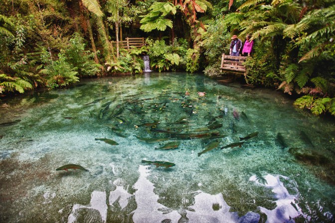 New Zealand is famous for its trout. Many fishermen say that some of the finest fly fishing in the world can be experienced here. Recently, when Pink Floyd’s Roger Waters performed his series of sold-out Wall concerts in Auckland, he was whisked off by helicopter between shows to try his luck landing some of our trout in secretive, out-of-the way places. Interestingly, it is illegal to sell trout commercially in New Zealand, though the number you take home to pan fry with almonds after a successful day’s angling is up to you. This is done to protect what has been described as a “world famous recreational resource”. New Zealand’s trout fishery is not native as, with so many creatures that inhabit Aotearoa, it was introduced. Rainbow trout, for instance, are believed to have been come from California in 1883. This photo was taken at Paradise Valley Springs Wildlife Park near Rotorua in the central North Island. The Ngongotaha Stream which runs through the park is the major trout spawning stream for Lake Rotorua and Lake Rotoiti and about 20,000 fish spawn in it annually. I was impressed by the walkway that wound around pools of crystal clear water and at the size of some of the trout. Kiwis will tell you that whether it’s Californian introduced rainbow, or the brown trout from Europe, our trout grow much bigger here than they ever do in their original habitat. Way bigger, and that’s no fisherman’s tale.