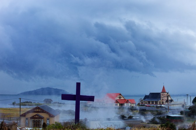 Ohinemutu is a suburb of Rotorua in the central North Island but was originally the name given to the region’s first Maori settlement. Here, beside the steaming lake, an elaborate marae, or Maori meeting house, was built alongside the lovely mock-Tudor church of St Faiths. Rotorua, of course, is famous for its geothermal activity and there are many places where you can see geysers, bubbling mud pools and steaming water. If you don’t like the smell of sulphur you won’t be too keen on Rotorua. This steamy lakeside area was all the more atmospheric on the day I visited because of the rainy weather which exaggerated the steam coming off the water. Early Maori chose this area for its lakeside setting and endless geothermal energy which they were able to use for cooking, bathing and heating. In pre-European times, Ohinemutu was the main centre for the Lake Rotorua region. Visitors and food arrived at this busy settlement before travelling on to the surrounding villages. Today, it’s still a hive of activity used by local Maori and visited by streams of coaches filled with tourists. Inside St Faiths, which is beautifully decorated with Maori carvings and and European stained glass, is a glass window behind the alter facing out towards the expanse of the lake. Upon the glass is etched the figure of Christ clad in a Maori cloak, or korowai, and he appears to be walking upon the water.