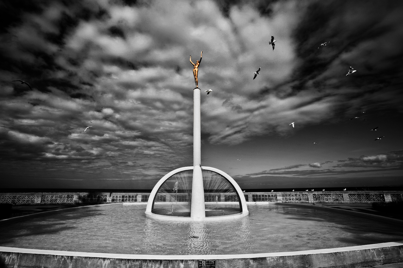 The Spirit of Napier statue on the city’s Marine Parade represents the rebirth of Napier, rising from the ashes following the devastating 1931 earthquake which left the city in ruins. Napier city centre was rebuilt in Art Deco style and today it remains one of the finest examples of that architectural style to be found anywhere in the world. In 2011 Napier Council approved the recasting of a new ‘Spirit of Napier’ sculpture in time for the Rugby World Cup using a high quality silicon bronze. It was reckoned that silicon bronze which would better withstand the harsh coastal elements. This photograph is of the original bronze statue and I have always liked it due to the dramatic lighting and seagulls in flight around it. The birds were actually interested in the sandwiches some council workers were eating just out of shot. One of the men threw a crust and the gulls pounced making for a suitably striking shot of a memorable piece of art.