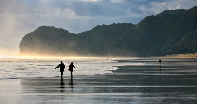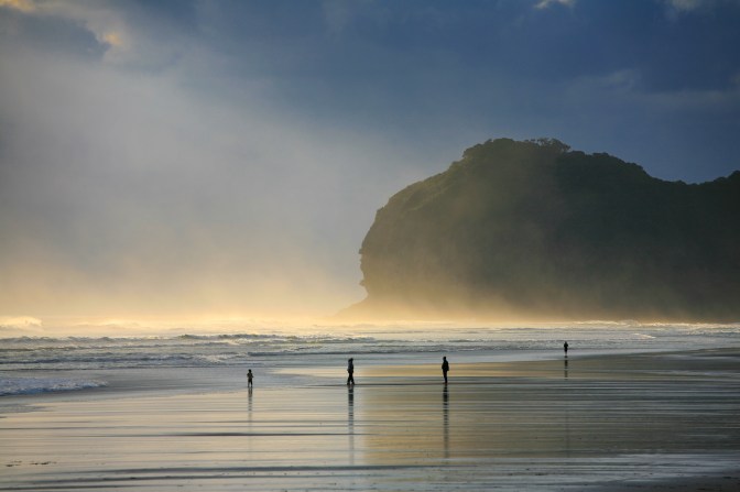 This will be my last entry for a month as I’m off to Trinidad and Tobago via San Francisco. So I thought I’d put up one of my favourite photos as a parting shot, as it were. It’s the original colour version of the black and white detail that makes up the header of this page. Piha is Auckland’s most famous surf beach, renowned for its dangerous rips and unpredictability. So dangerous can it be a reality TV series is made each year focusing on the work of the local life saving crews called Piha Rescue, which says all that needs to be said about the perils of swimming here. But that doesn’t stop hordes of holiday makers doing so every summer, some of whom get into difficulties after downing one too many beers in our unforgiving, burning sun. No danger of drowning, you’d think, when this mid-winter photo was taken. But Kiwis are hardy, and some might say foolhardy as, shortly after this was snapped, a man stripped off and ran into the freezing surf, though he didn’t stay submerged too long. I was so lucky to be there at the moment the sun peaked out of the clouds, bathing this scene is such a dramatic way. I feel it sums up the dangerous magnificence of Piha perfectly. Later the sun came out properly and so did the beach walkers, revelling in the beauty of this wonderful place.
