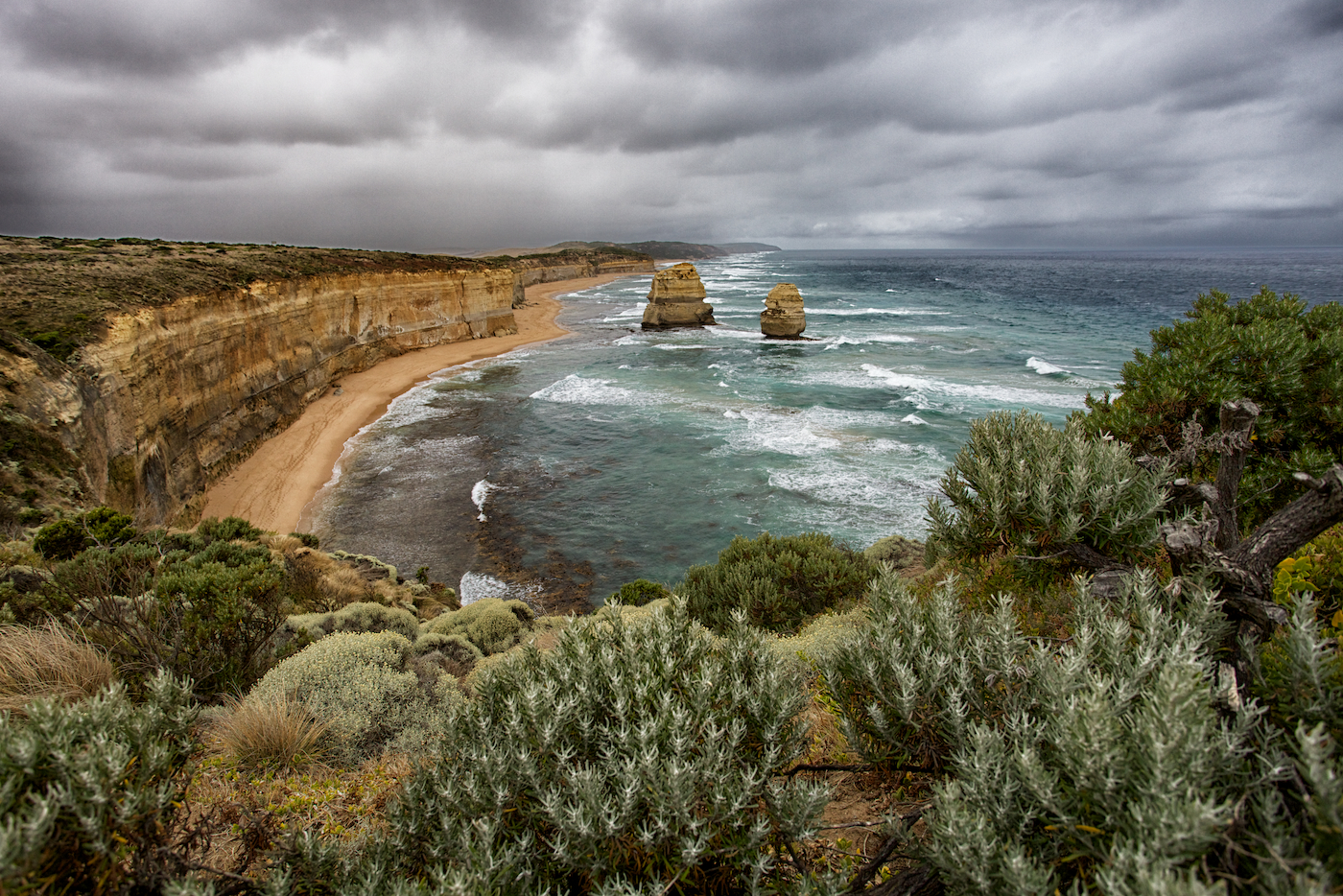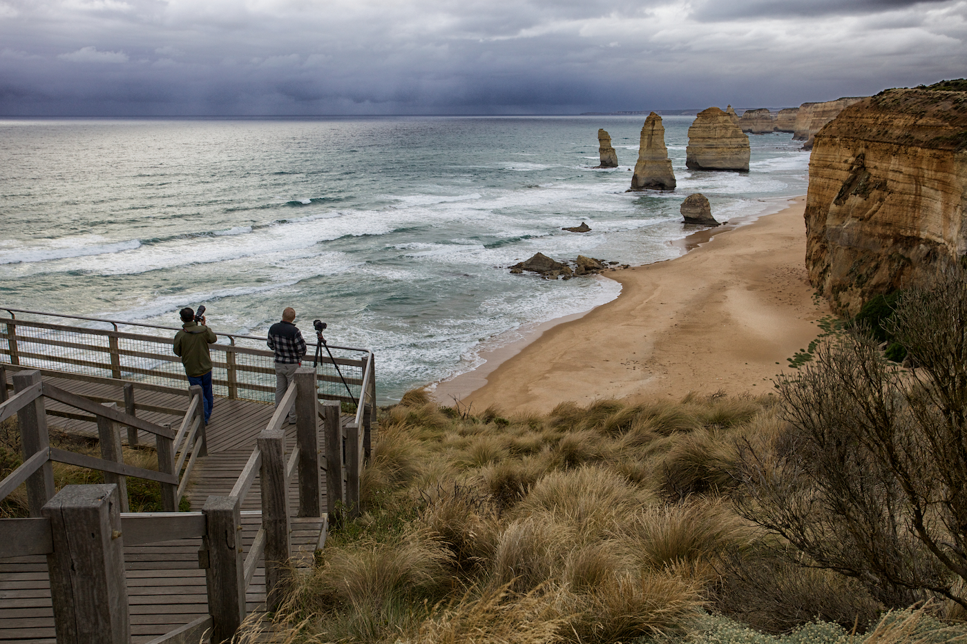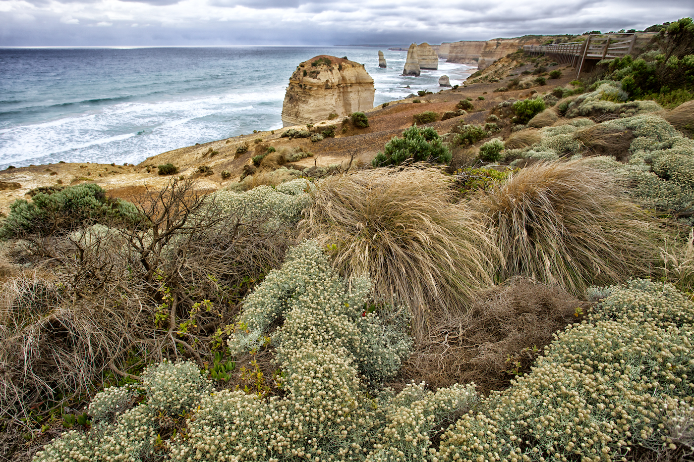 The highlight of our 6-day visit to Melbourne last week was driving the Great Ocean Road to see The Twelve Apostles, massive limestone pillars that rise 65m out of the Southern Ocean in an area aptly known as The Shipwreck Coast — 700 ships have come to grief here over the last few hundred years. The erosion of the cliffs, 2cm a year, shows the power of the sea, evident in the relentless pounding of surf on shoreline. It’s an awesome place and draws hordes of tourists, the beneficiary being the village of Port Campbell where we overnighted. The weather wasn’t great but we got a brief burst of sunshine early in the morning which made for some dramatic lighting. The Twelve Apostles are part of the Port Campbell National Park and the authorities have done an excellent job building a tunnel under the main road which leads to excellent boardwalks and viewing platforms of the coastline. The vegetation along the walkways and planted by the cliff the cliff edges is interesting and attractive. Nearby you can access the beach and two impressive Apostles by way of the Gibson Steps, worth doing so as to get a sense of the scale of these wondrous formations.