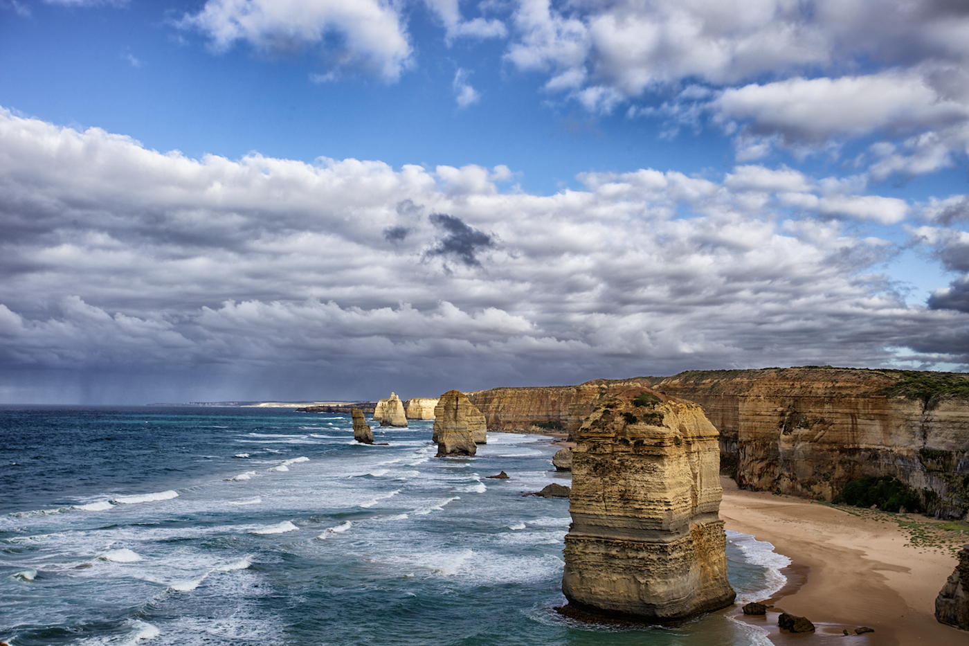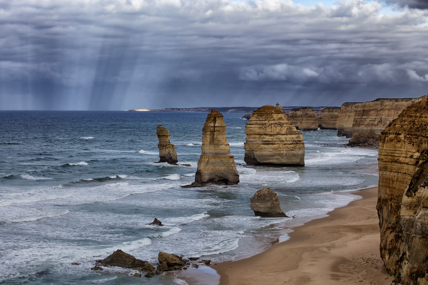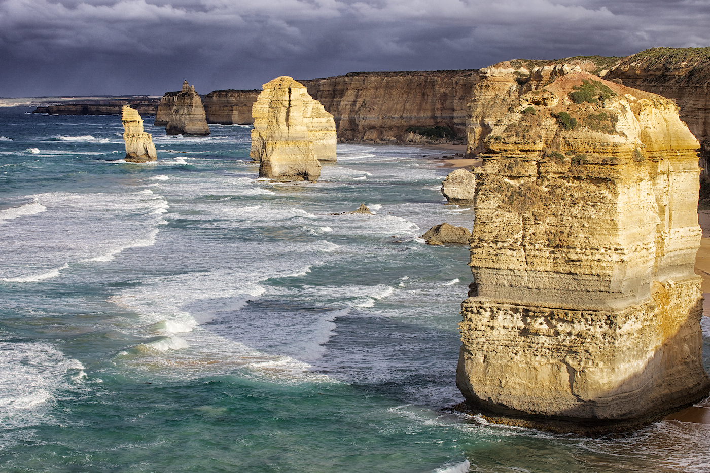 The highlight of our 6-day visit to Melbourne last week was driving the Great Ocean Road to see The Twelve Apostles, massive limestone pillars that rise 65m out of the Southern Ocean in an area aptly known as The Shipwreck Coast — 700 ships have come to grief here over the last few hundred years. The erosion of the cliffs, 2cm a year, shows the power of the sea, evident in the relentless pounding of surf on shoreline. It’s an awesome place and draws hordes of tourists, the beneficiary being the village of Port Campbell where we overnighted. The weather wasn’t great but we got a brief burst of sunshine early in the morning which made for some dramatic lighting. The Twelve Apostles are part of the Port Campbell National Park and the authorities have done an excellent job building a tunnel under the main road which leads to excellent boardwalks and viewing platforms of the coastline. The vegetation along the walkways and planted by the cliff the cliff edges is interesting and attractive. Nearby you can access the beach and two impressive Apostles by way of the Gibson Steps, worth doing so as to get a sense of the scale of these wondrous formations.