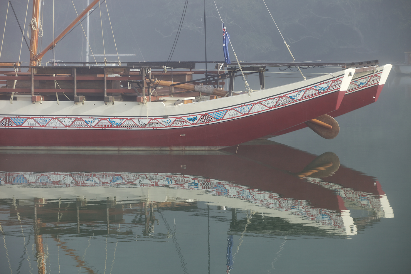 Winter is drawing in and with the cold mornings and clear skies comes fog. It blankets the valleys in a wondrous, ghostly disguise and I love to take my camera out into the eerie conditions when the sun is trying to peep through the “pea souper” surroundings. The light is so interesting. Rivers are always a great location when the fog comes down and the extensive waterway of Lucas Creek, around which the suburb of Greenhithe sits, is such a place. Ghostly Greenhithe it certainly was. So still, so quiet; just the odd cry of a gull somewhere in the fog the only interruption to the overwhelming symphony of nothingness. And, like a mirage appearing out of the mist I, came across the Hinemoana, pictured above, a beautiful and striking catamaran with Maori/Polynesian motifs running along its twin hulls. A totally unexpected and delightful surprise. As I explored, as far as I could without falling in the river, other boats appeared out of the fog, the separation of water and sky undetectable, as though they were floating in a vacuum. But, all too soon, the sun’s rays were stripping away Greenhithe’s foggy disguise and familiarity returned. And so shall my camera and I.