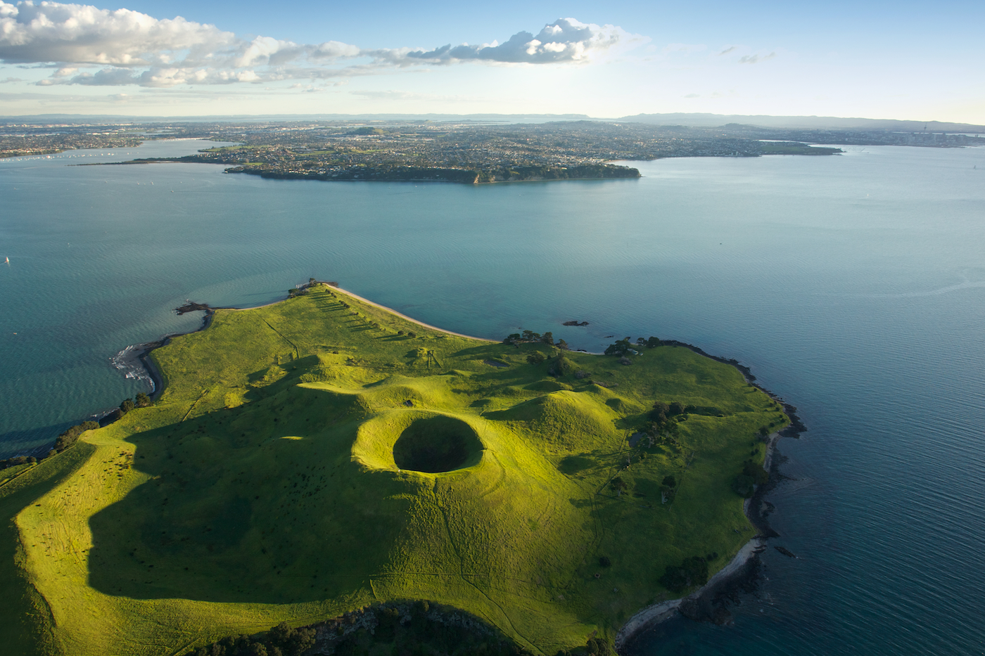Grafton Volcano, greater than 45,000 years old; also Rangitoto island volcano, with the peninsula on the left comprising Mt Victoria volcano and North Head volcano.