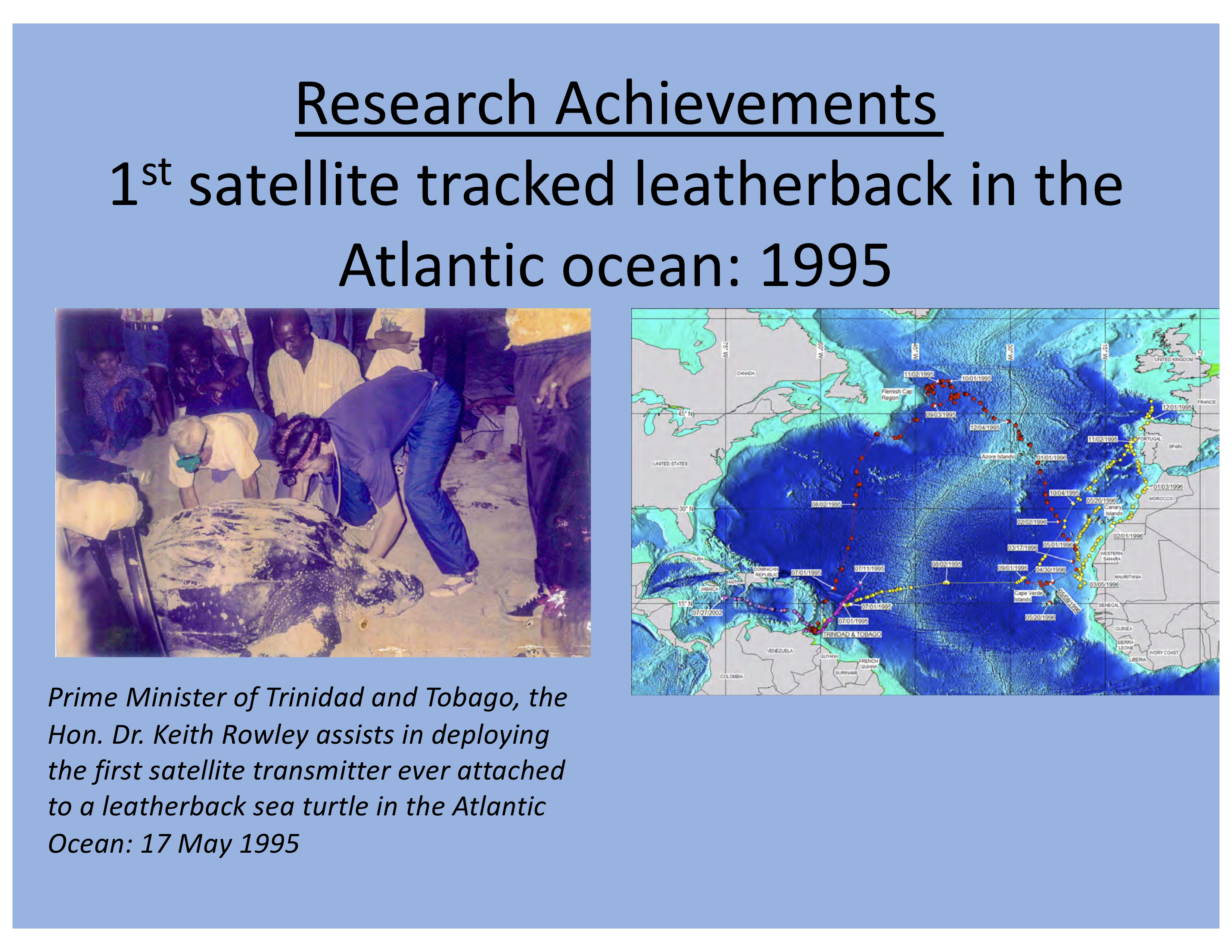 THERE’S A 1995 PHOTOGRAPH of Professor Scott Eckert, the Director of The Wider Caribbean Sea Turtle Conservation Network (WIDECAST), attaching the first satellite transmitter ever attached to a leatherback, on a Trinidad beach in the dark.