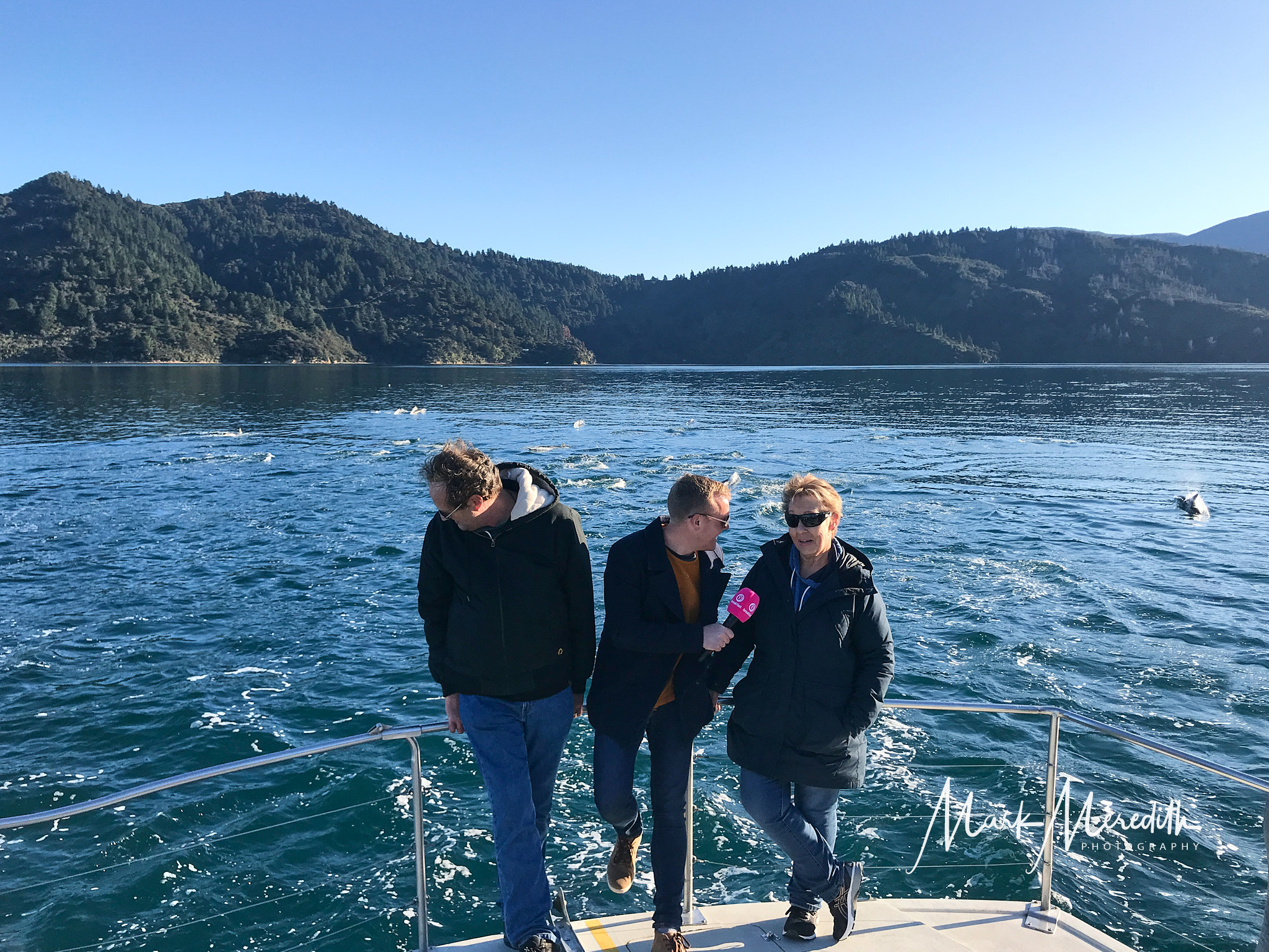 A colony of king shags, one of the rarest birds in the world, whose numbers are estimated at around 600, sat on a rocky outcrop inviting photos. And there were seals, and dolphins; a lot of dolphins. None of us had ever seen so many dolphins. We tracked a huge pod of common dolphins that had come into the sound for a feed. Matty McLean did a piece to camera with the water behind him boiling with dolphin activity.