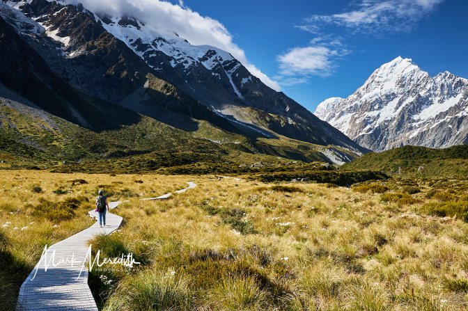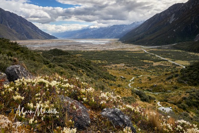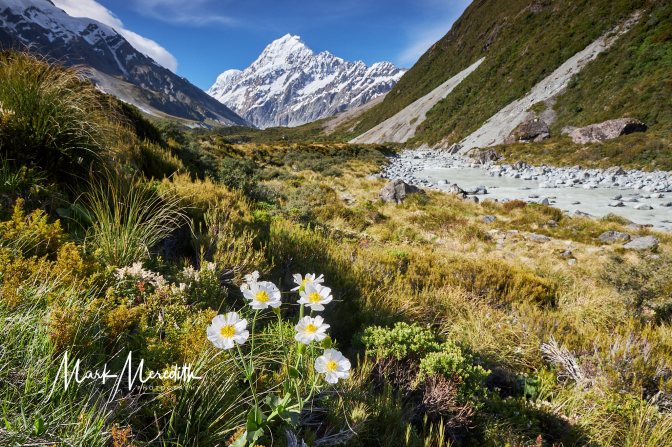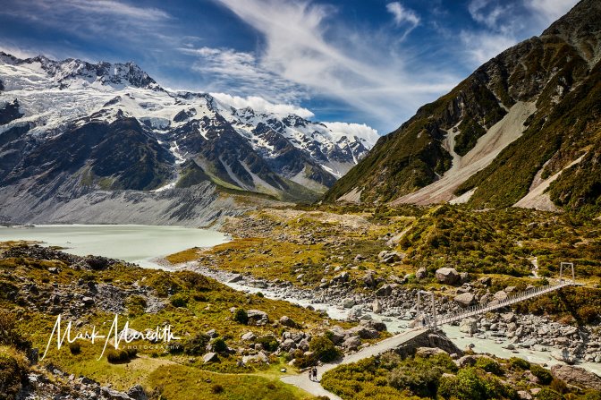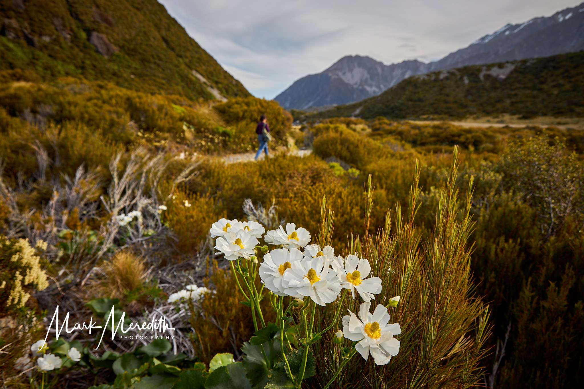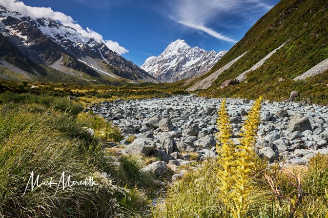 After crossing the Mueller Suspension Bridge, the landscape changes as you follow the Hooker River to its source, the glacial lake below Mt Cook. The valley suddenly opened up and a brilliantly constructed boardwalk took us over snow tussock, spear grass, large mountain daisies, and the iconic Mount Cook Lily which sprouted in beautiful clumps at the pathway’s edge. At the end, above the freezing glacial lake, Mt Cook rose into the blue sky above us, jagged, dangerous, dazzling, wonderful. What a finish. Now we just had to walk all the way back.