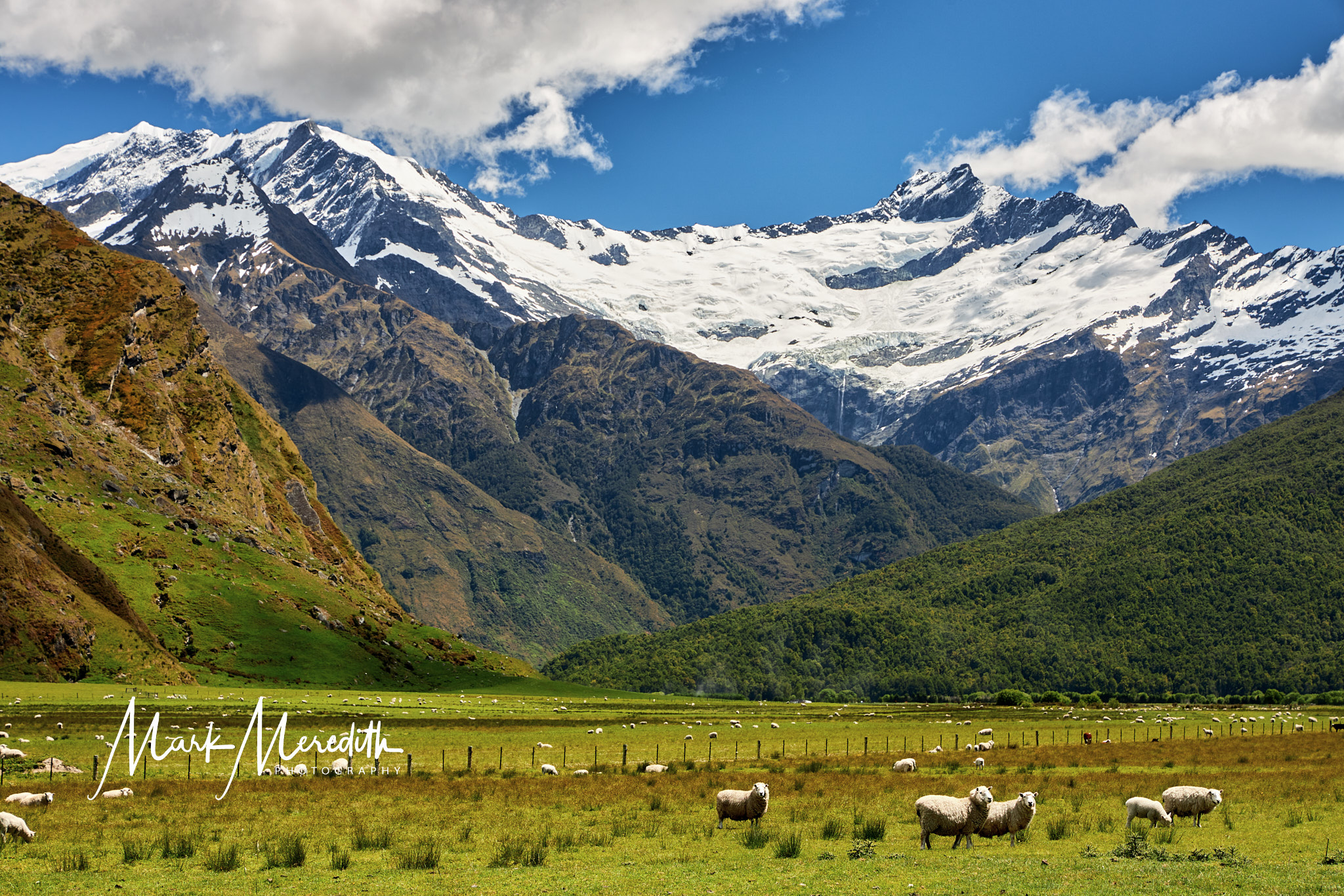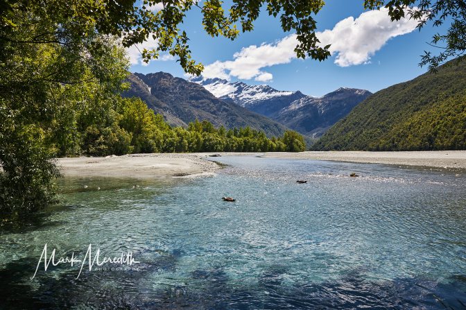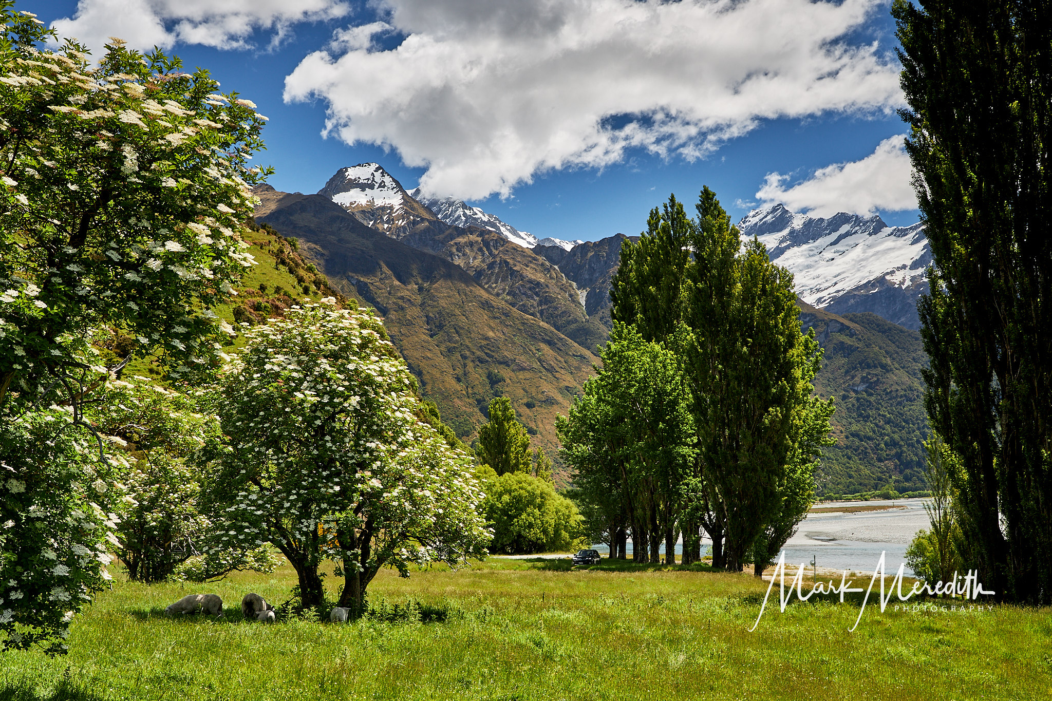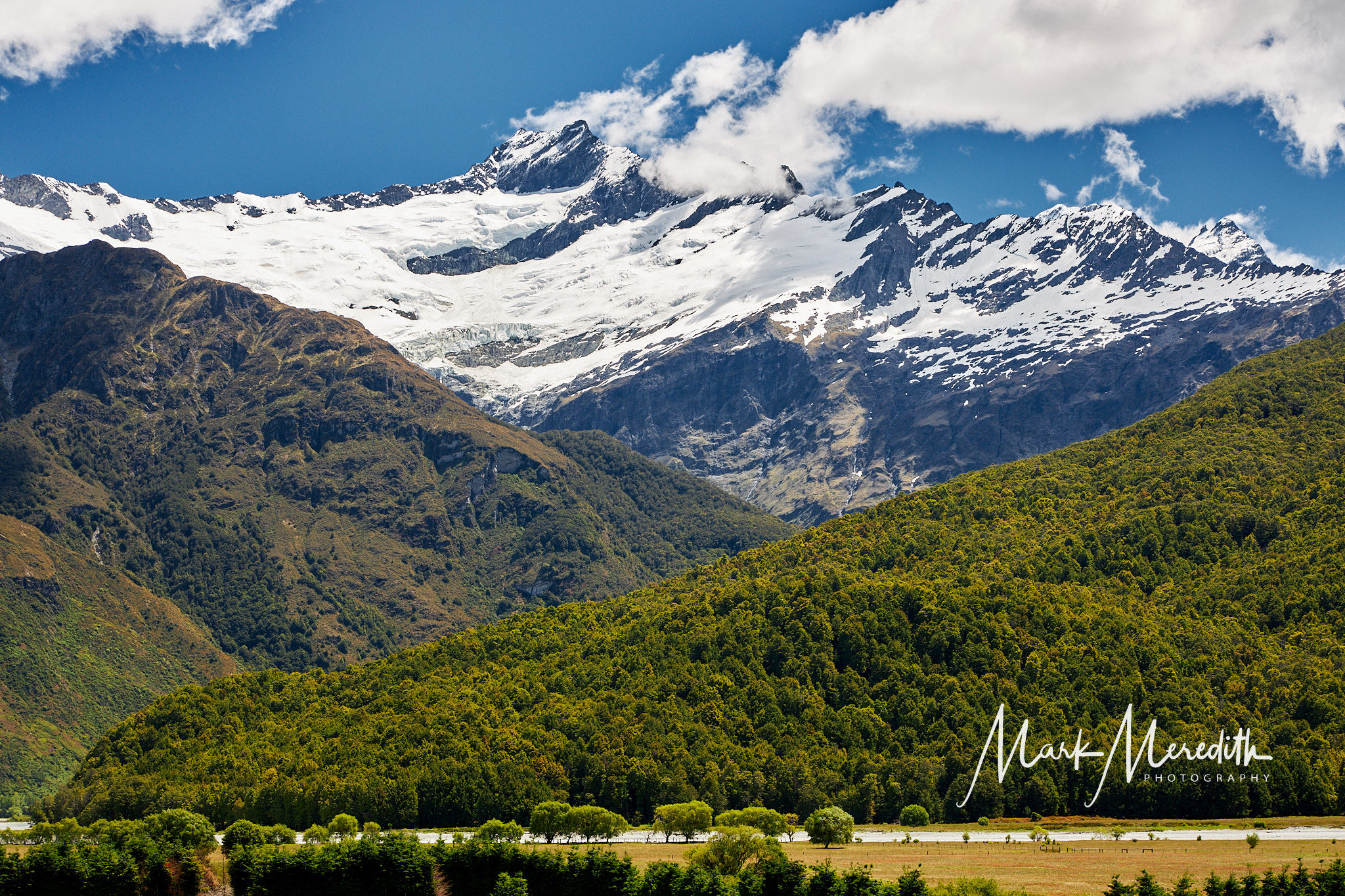 The weather was glorious, puffy white clouds on a deep blue sky brushing snowy mountain peaks, the scenery even more impressive than I remembered. Mt Aspiring – isn’t that a wonderful name?– is one of New Zealand’s tallest mountains and gives its name to a vast national park which straddles the “main divide” of the Southern Alps. This great wilderness has everything: glaciers, mountains, snowfields, beech forests, rivers, waterfalls, green valleys and river flats where sheep and cattle roam.