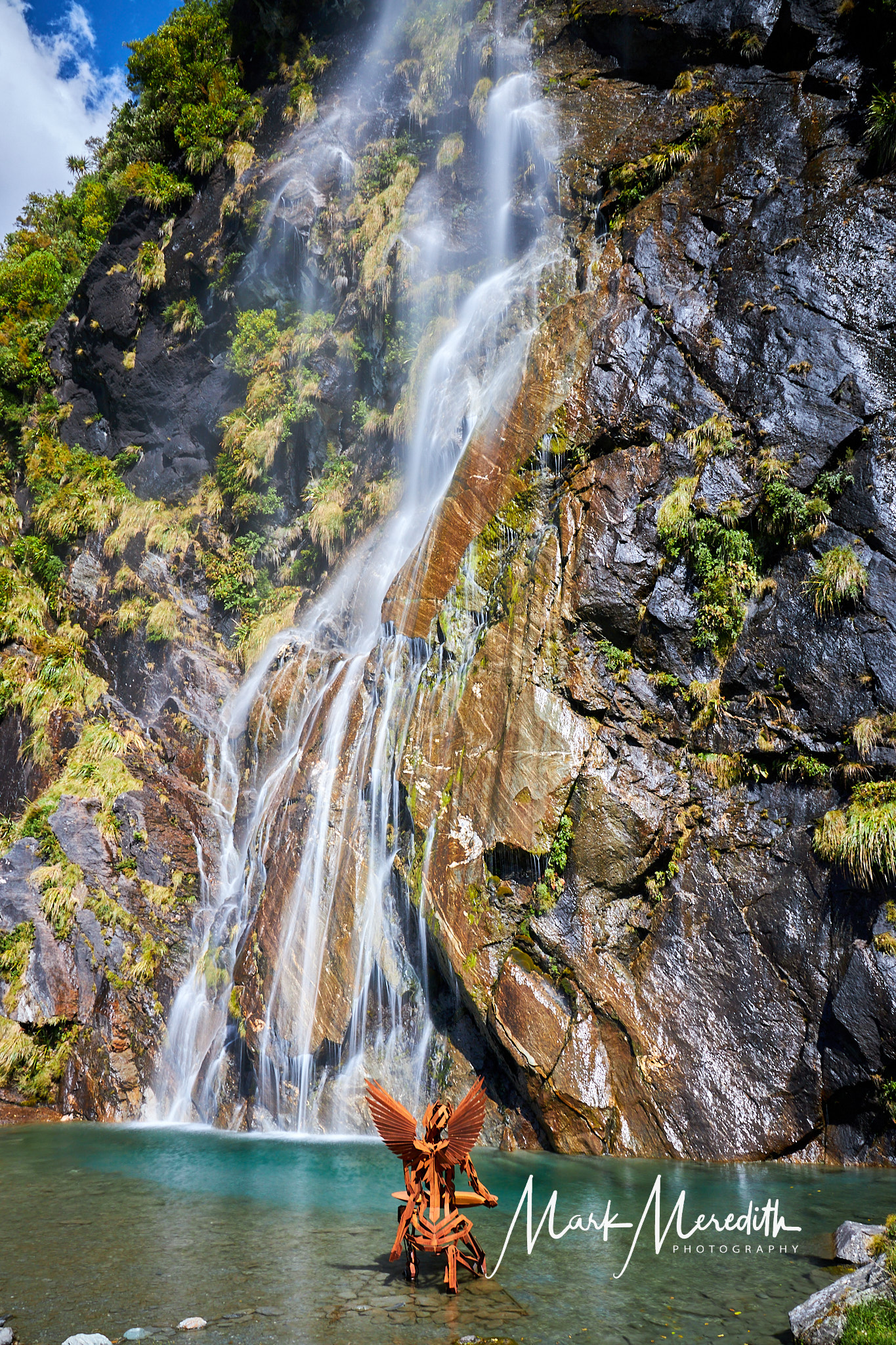 One of our stops was at Wishbone Falls which we could see tumbling 77 metres down a mountainside in an idyllic valley. It’s a short walk from the roadside through fields to what is a popular swimming spot, apparently. The water in the shallow waterfall pool was icy cold. At the foot of the waterfall is a strange sculpture, called Iris, by Simon Max Bannister. Inspired by the Greek goddess of the rainbow, Iris is poised to catch the falling prisms from the waterfall spray in the disk she holds.