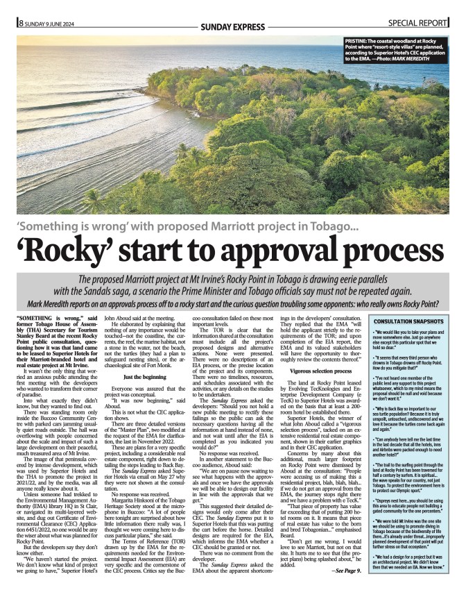 “Something is wrong”, said former Tobago Secretary for Tourism Stanley Beard at the Rocky Point public consultation, questioning how it was that land came to be leased to Superior Hotels for their Marriott-branded hotel and real estate project at Mt Irvine. (See sidebar/story)
