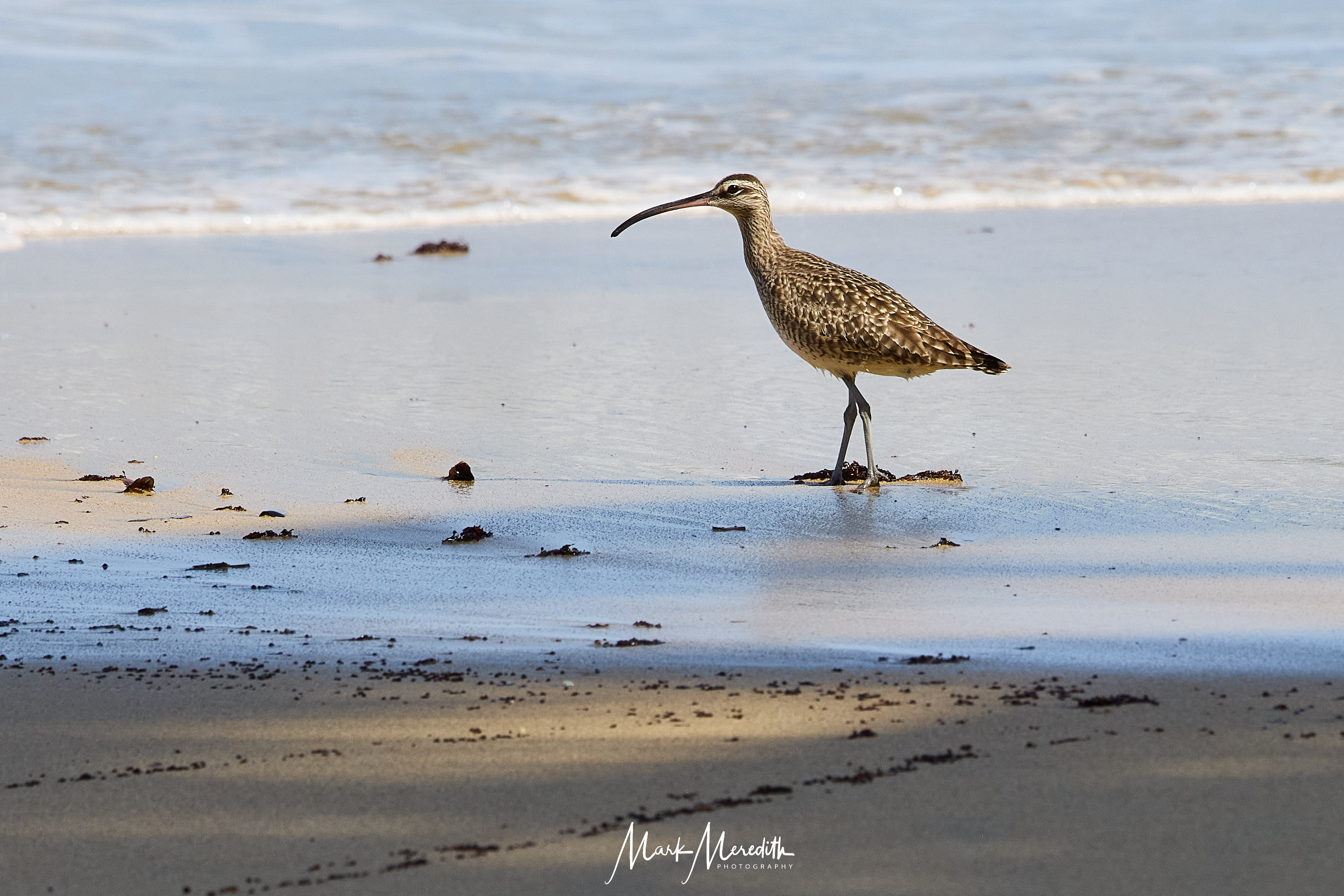 By now the sun was higher, the sea pale blue with walls of imposing breaking waves glinting, spray flying in their wake, the view north up the coastline quite lovely. Small flocks of ringed plovers were running about before surging water, while a wintering Hudsonian whimbrel with its long curved beak sauntered sedately along the shoreline looking for breakfast.